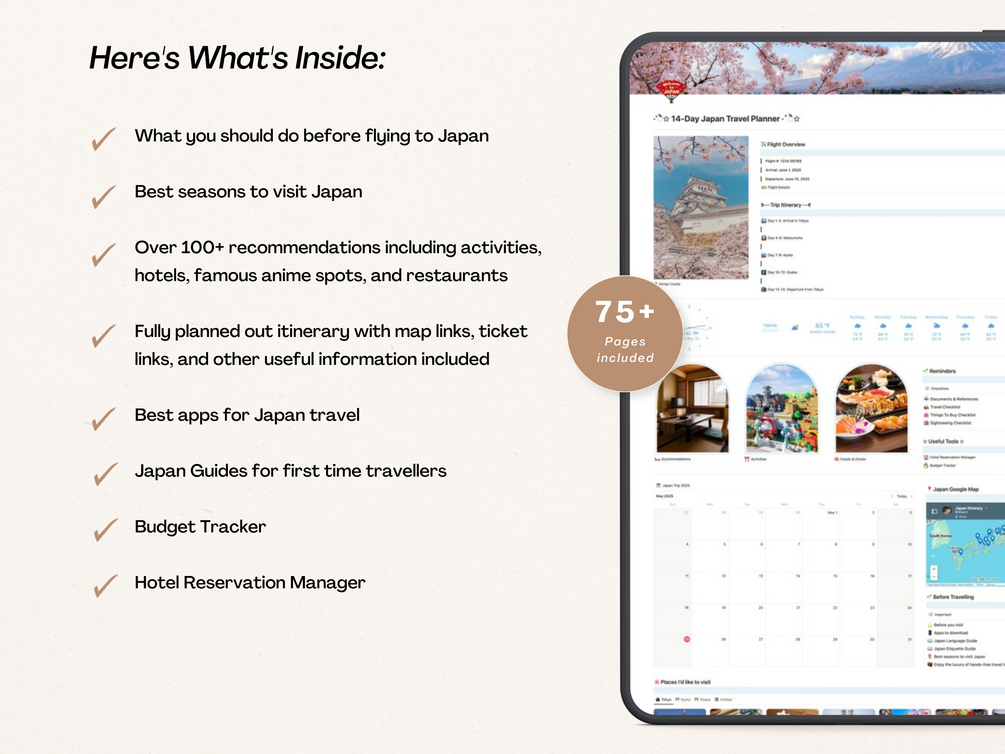 Our 14-day Notion Japan travel planner is perfect for first time visitors to Japan. If you are looking for a well researched itinerary, this is the perfect Japan travel planner for you.