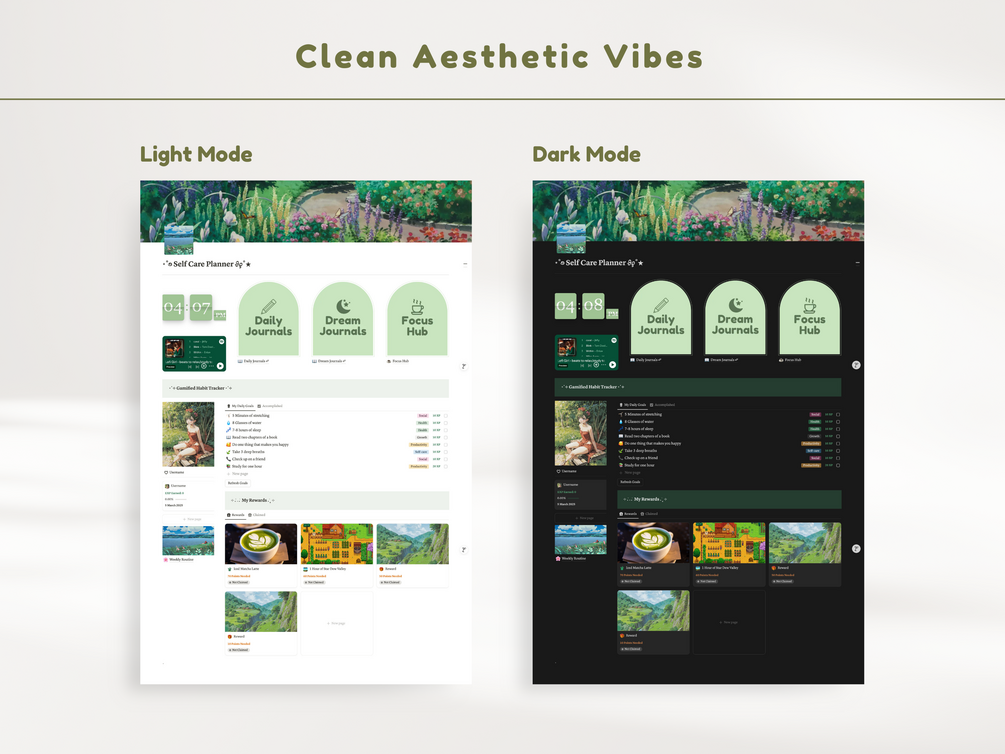 This mental health Notion planner helps you take care of yourself in a fun, rewarding way. The gamified habit tracker and automated rewards keep you motivated, while the daily and dream journaling sections let you reflect and explore your thoughts.