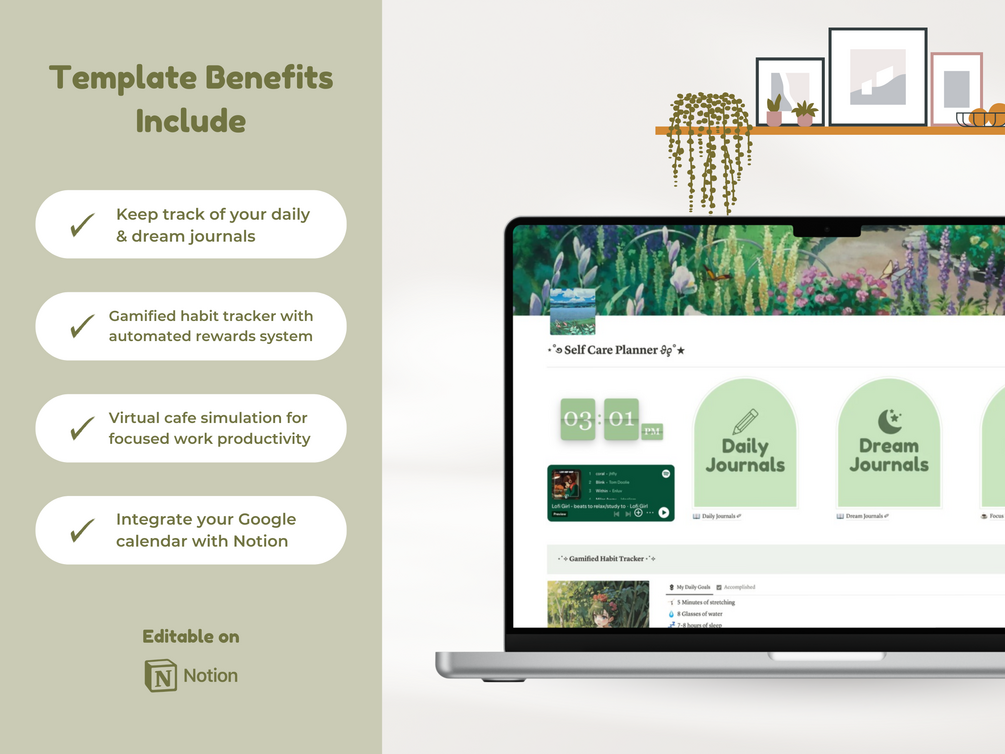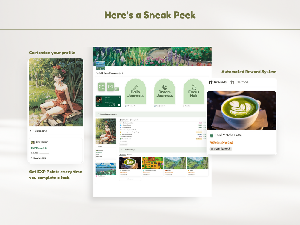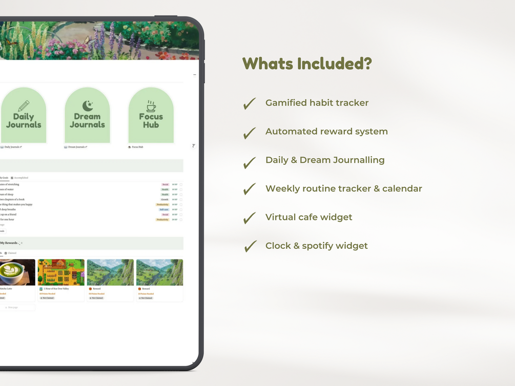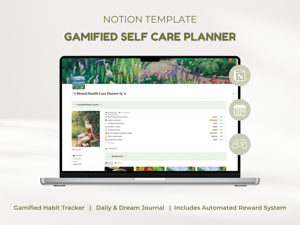 This mental health Notion planner helps you take care of yourself in a fun, rewarding way. The gamified habit tracker and automated rewards keep you motivated, while the daily and dream journaling sections let you reflect and explore your thoughts.