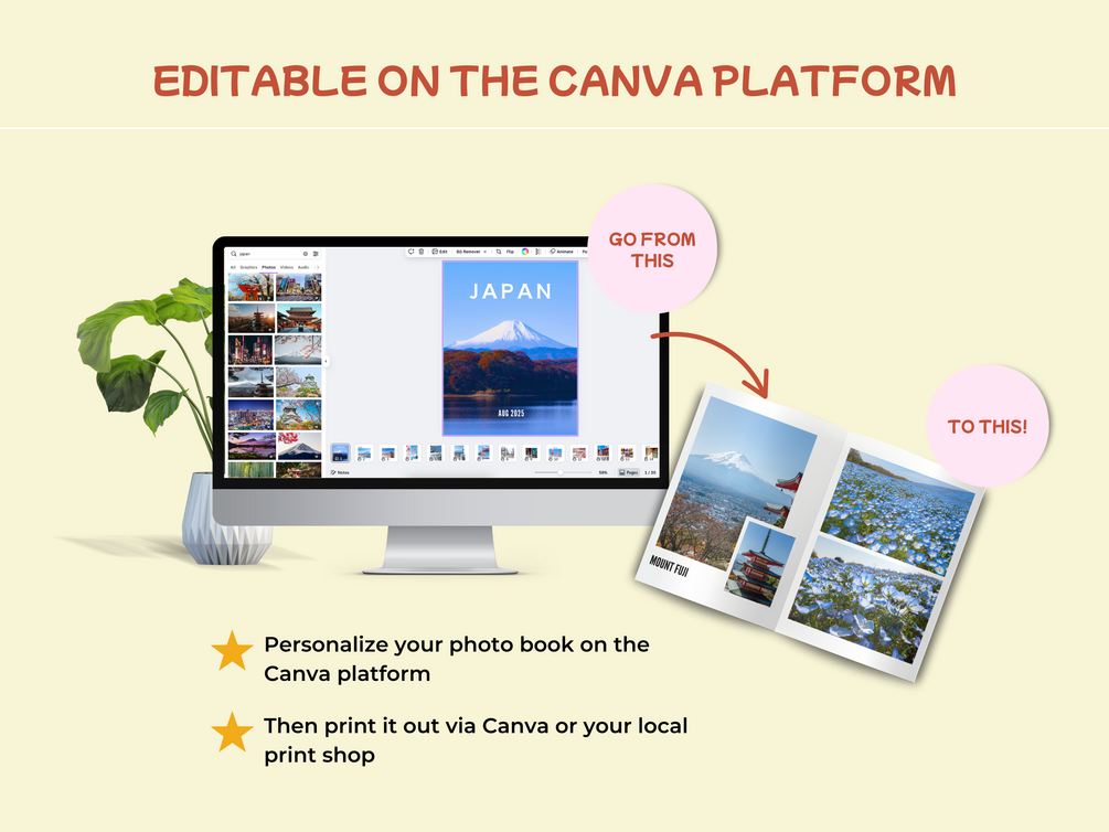 Super easy to customize on the Canva platform. Edit your fonts, colors, images, and more on a free Canva account, then print your photo book via Canva or your local print shop!