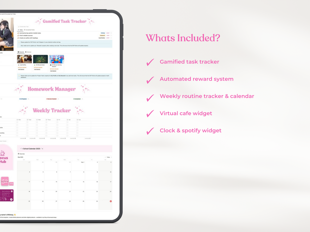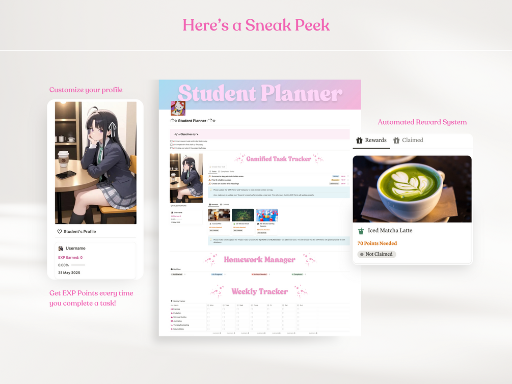 Stay organized, motivated, and balanced with this all-in-one Student Planner! Designed to help you manage tasks, track habits, and prioritize mental health, this Notion template combines productivity with fun through a gamified task tracker and automated rewards system.