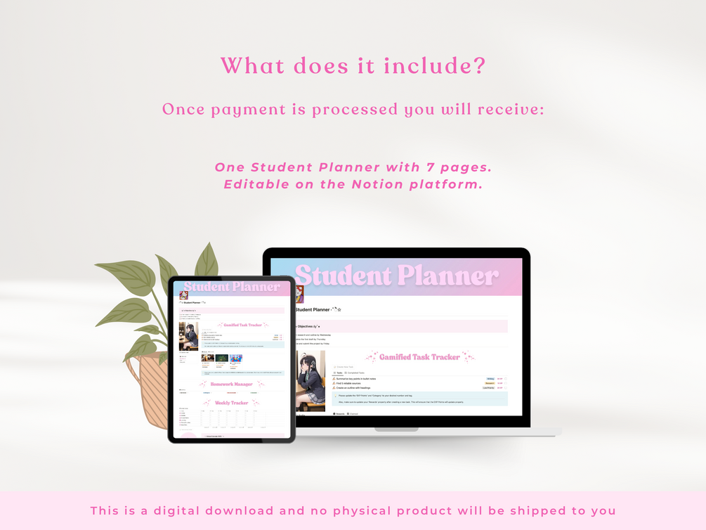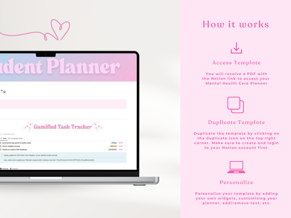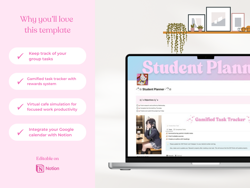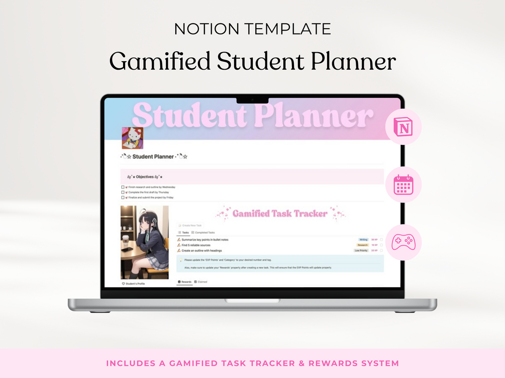 Stay organized, motivated, and balanced with this all-in-one Student Planner! Designed to help you manage tasks, track habits, and prioritize mental health, this Notion template combines productivity with fun through a gamified task tracker and automated rewards system.